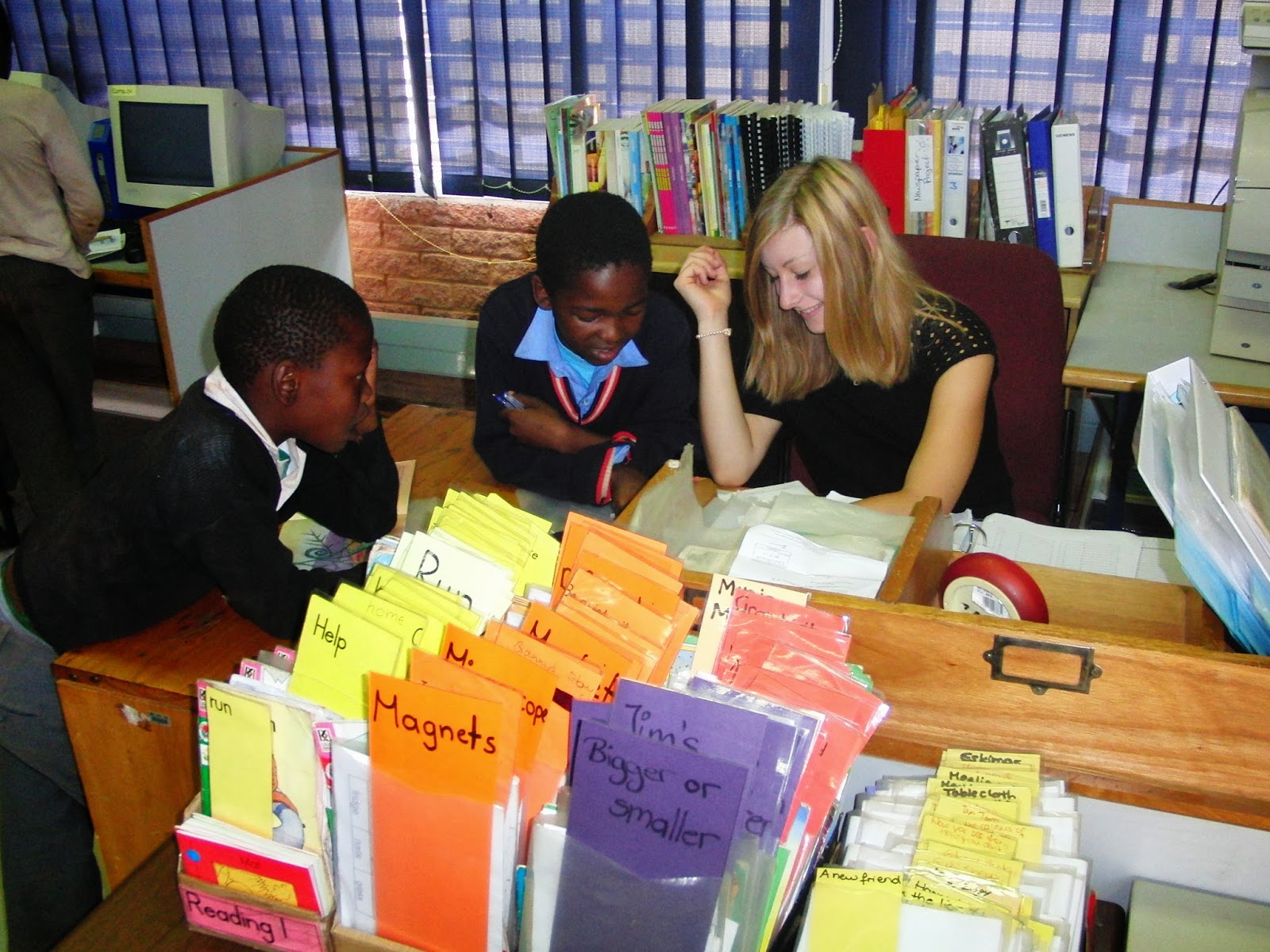 Ich arbeite ja an der Makgatho Primary School in der Library. Morgens um halb 8 gehts los und ich fahre mit meiner Ma und Timo(Mitfreiwilliger) zur Schule und nachmittags gegen 3 oder halb vier laufen wir dann wieder nach Hause.Die Zeit dazwischen vergeht wie im Flug. Wir arbeiten in einer Library und an einem Reading Projekt. Und sobald wir die Zeit haben werden wir einige Workshops wie zum Beispiel Basteln oder Sport mit den Kindern starten. Da haben wir absoluten Freiraum, die Library ist auch absolut unser Bereich und wir duerfen unsere eigenen Regeln aufstellen. Reading Projekt heisst wir lesen mit den Kindern einzeln an Buechern und jedesmal wenn sie ein Buch geschafft haben, bekommen sie ein neues, das etwas schwieriger ist. Die Kinder hier sind sehr begeistert was lesen angeht, ich glaube da wuerde man in einer deutschen Grundschule nur auf taube Ohren stossen. Allgemein sind die Kids hier sehr flexibel. In der library findet man auch Puzzle und Memoriespiele die die Kinder mit Begeisterung spielen, ob da mal ein Teil fehlt oder 3 Memories vermischt sind und es zu der Haelfte der Karten keine Partner mehr gibt, das macht gar nichts :D. Achja die Kinder :D.. da kann man viel zu sagen, sie schreiben uns supersuesse Briefe, sind ganz lieb wenn man mit ihnen liest und echt herzlich. Aber sie sind auch anderen Umgang gewoehnt als deutsche kinder..ein bisschen rumschubsen und an den armen fassen oder raustragen muss da auch mal sein. also wehe es mangelt an Durchsetzungsvermoegen.